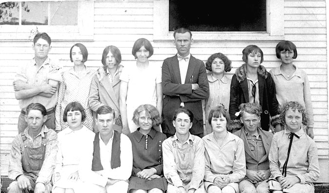 Back-Left to right:Harley Elson,Gussie Ballard, Mary Williams,Beatrice Lowry,Unk., Teacher. Gearldine Wicks,Edna Pearl Kennedy, and Gladys Davis. Front. Left to right: John Lee Bell, Opal Bell,Unk, Elverta Foster, unk,Maurine Smith,unk and Fay Watkins. |