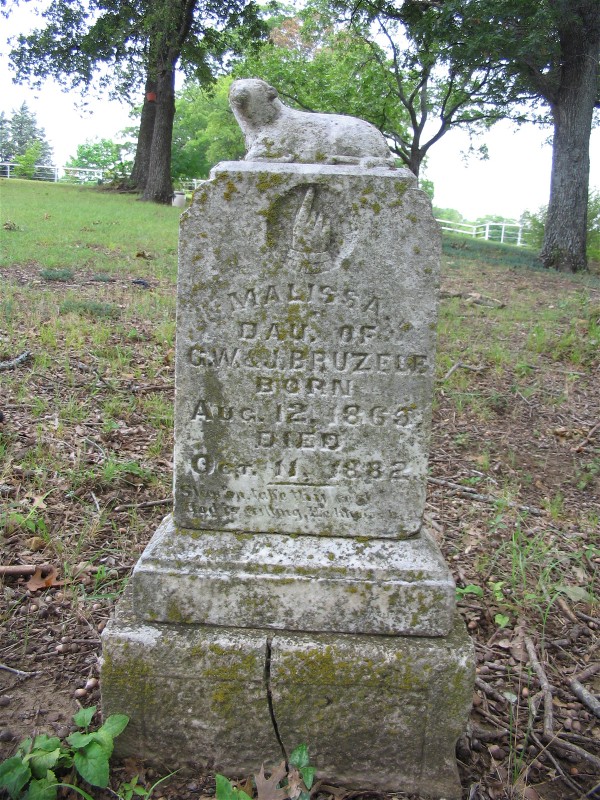 Malissa is buried in the Gilbert cemetery by her mother Jane Bradberry Hunt Brazele Wade. Molissa's father was Henry Willis Bruzele/Breazeal. He was born in Tenn. in 1807 and died in Cook Co.,Texas in 1867. George Boxley Wade was her stepfather. she was only 17 years old and unmarried. I don't know the cause of her death. ....notes by Betty Phillips