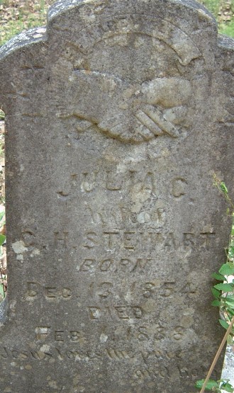 In the Van Zandt county 1880 census, Julia was living with her husband, Cortutian H. Stewart, who was a farmer, and their two little girls, Frances, age 2 and Mary, age 1. They had lost another daughter in 1878, Mariah, who would have been 3 years old in 1880, and a son, Gussie, who died in 1886. Mariah and Gussie were both just 1 year old when they died. They are buried near Julia. C. H. & Julia had 3 more children after 1880, who lived. A son, William was born in 1883, a daughter, Maybell was born in 1886, and a daughter, Della C. was born in Jan. 1888. Julia died soon after the birth of Della. All of the children attended school and could read & write. Son, William, a farm worker, only attended school 3 years, but could read & write. Julia was born in Texas and both her parents were born in Alabama. Julia was the first wife of C. H. Stewart. He later married twice more, in 1889 and again in 1903, each of the two women had been widows. His second wife, Sallie E., is buried near Julie. By the 1910 census, C. H. and son Charlie were living in the home of his daughter, Frances Stewart Grammer and her husband, W. I., and their children. (Research by Betty Phillips using the Van Zandt County US census, Jones Cemetery and the VZC Marriage Records Book 1848 - 1909)