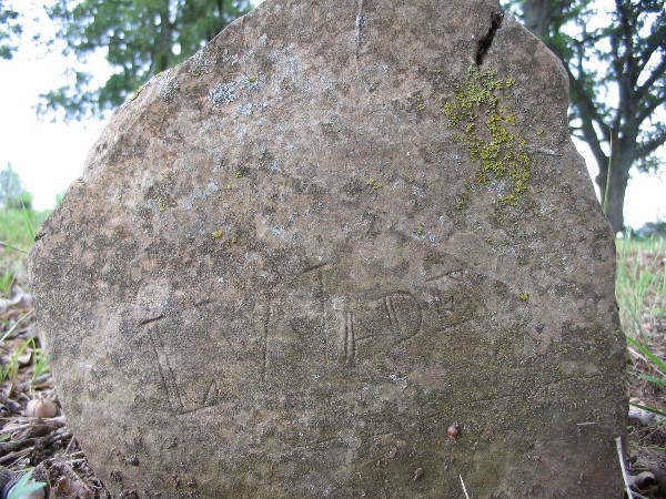 The rock is very small, probably 6 or 8 inches across. Here are two pictures showing the location in the Wade row at the cemetery. The small rock at the left of the tombstone is for Lucy. It needs moving over just a bit to the left to match the footstone.