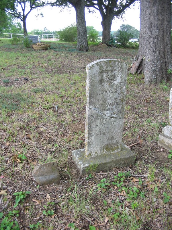 1880 Van Zandt co., Texas census, G. B. Wade, age 73, head of household, Jane, wife, age 50, Malissa Brazile, age 14, (Malissa died 2 years later and is buried beside her mother, Jane), John Kuykendall, age 5, (This was a grandson of Jane. His mother, a daughter of Jane, had died in childbirth), A laborer, Ed Carl, age 18 was also living in the household. Jacob Jones and wife, Jane Ann, sister of Lucy, and four children were living next door. Lucy had died before the census was taken in 1880.