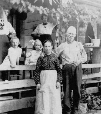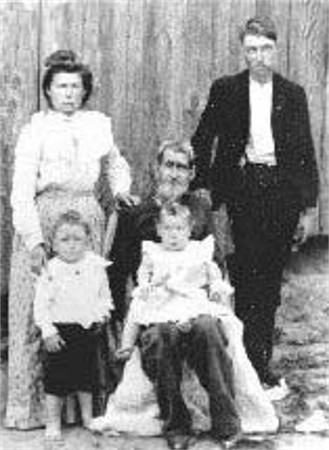 The family of John Henry McGhee and Tennie Maye Cathey McGhee taken in Wood Co. in 1908 or 1909. Front row l. to r. John Henry; son, Clarence Newton; wife, Tennie Maye; daughter, Winnie Jane. Back row l. to r. Nellie May (Kirkland); Mary Elvira Banks, Widow of Newton John McGhee; Vallie Ree (Usury). Nellie and Vallie are John Henry's daughters from his first wife, Martha "Mattie" Rape. Photo courtesy Gary McGhee.